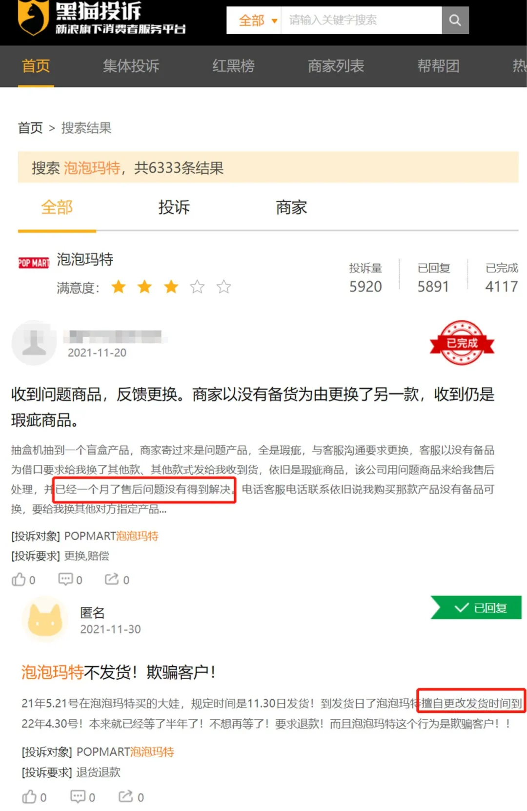 截止到2021年12月16日,在黑貓投訴平台上,關於泡泡瑪特的投訴量高達5920條,這一年就投訴了3300多條,相當於每天都有10條投訴。