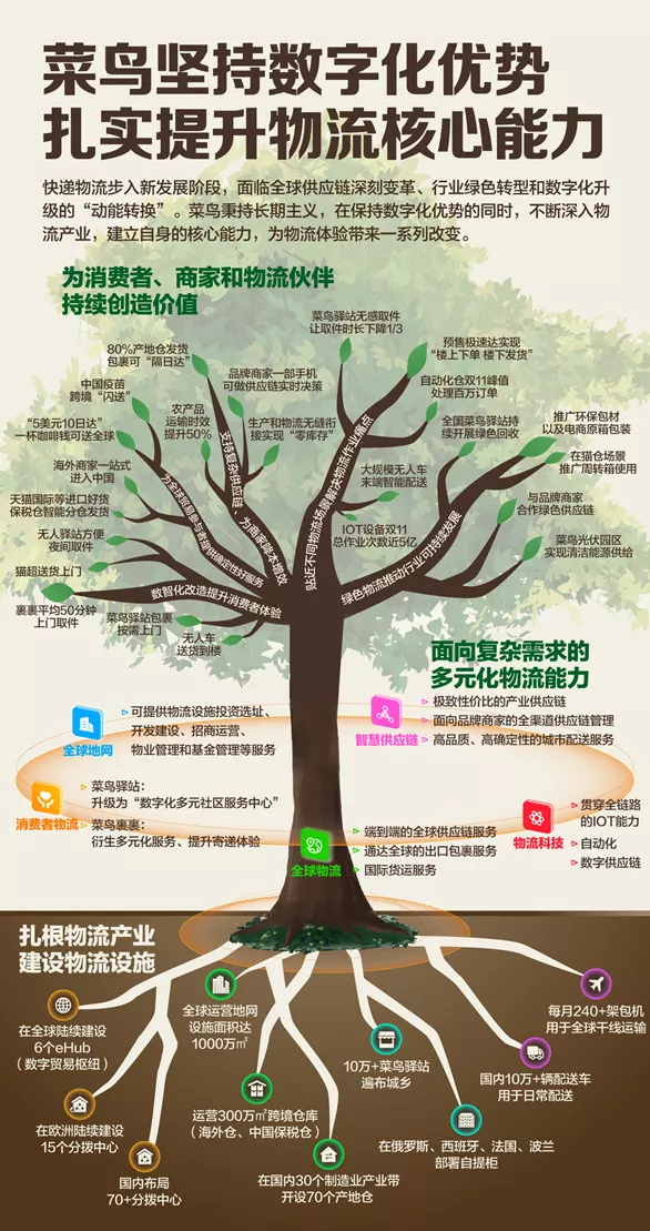 尤其是在國際、鄉村、供應鏈等物流增量的新賽道,菜鳥選擇了直接下場——通過持續投入物流設施“築基”,輔以互聯網數字化“添翼”,不斷加大自身物流底層能力的投入。構建了顯著區別於其他物流公司的核心競爭力,比如全球化、數字化。