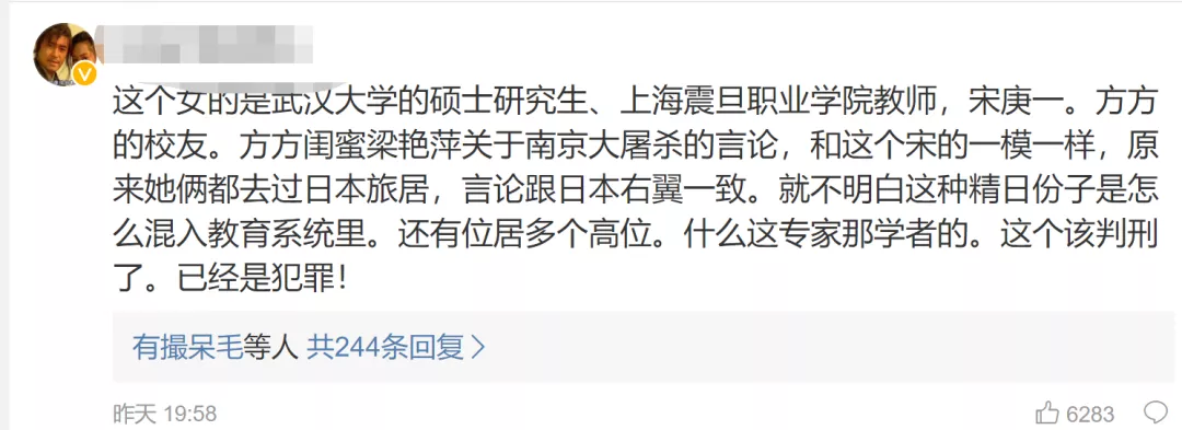 至於這個宋庚一,水平就太差了,她甚至對時事也一無所知,乃至於造謠説“國家公祭日是因為日本抵制冬奧會”……她身在上海,離南京那麼近,居然不知道國家公祭日從2014年開始設立的,每年這一天南京市民都會聽着警報肅立。