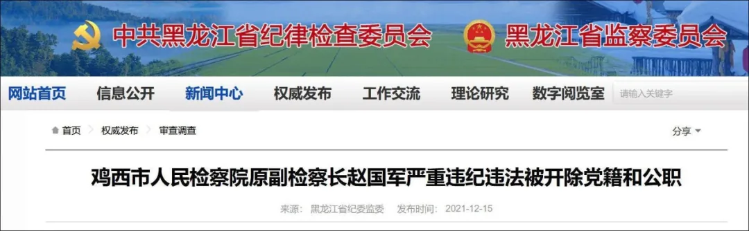 長期吸毒者在此:據《黑龍江日報》12月15日報道,日前,雞西市紀委監委對雞西市人民檢察院原黨組副書記、副檢察長、二級高級檢察官趙國軍嚴重違紀違法問題進行立案審查調查。