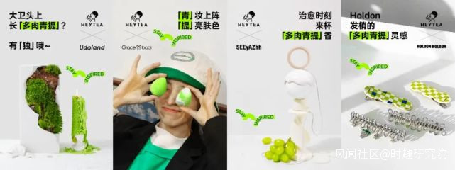 近日,喜茶也官宣流行色「多肉青提色」,與 EvolveTogether、非必要不合作 、INSO、Gracebabi、Udoland 有獨等多個原創設計師品牌展開了“綠色”的聯名合作。推出多肉青提小夜燈、香氛蠟燭、大衞香氛蠟燭、超大帆布包、防護口罩、美妝彩蛋、指甲油套裝、髮飾等等。