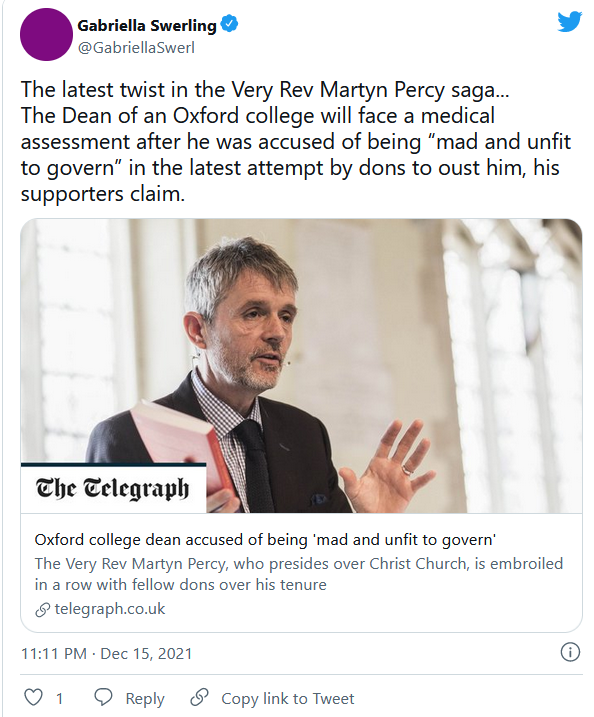 基督堂學院的理事會預備成立專家小組鑑定院長波西(the Very Rev Martyn Percy)的精神狀態,是否適合續任院長。雙方的爭執起於2018年,薪酬是原因。