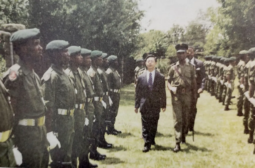 1998年2月,陳來元大使向萊索托國王遞交國書後在王宮御花園內檢閲該國儀仗隊。(《國家形象》圖)