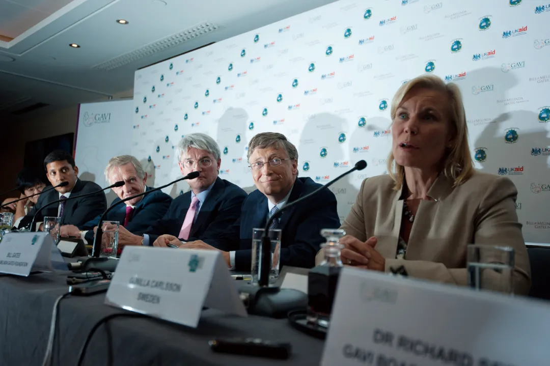 ▲2011年6月13日,英國倫敦,比爾·蓋茨(右二) 參加全球疫苗接種聯盟(GAVI) 新聞發佈會。去年美國的一個民調顯示,很高百分比的美國人相信比爾·蓋茨會通過混在新冠疫苗裏的納米機器人來監控他們