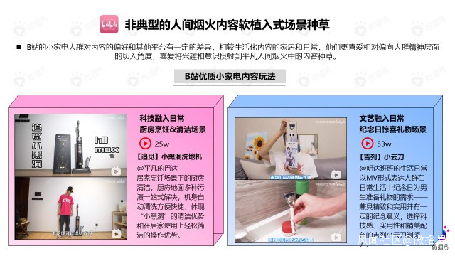 【Bilibili】B站的小家電內容基於社區式文化,圈層內部的連接緊密,平凡生活中不凡思維是人羣爭相擁護的焦點,年輕人更喜歡“形而上”,將美、藝術與科技融入平凡日常是新機會點。