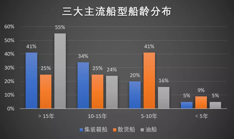 按照目前的船型更換週期,集裝箱船在20年左右就需要更換,幹散貨和油輪則在20-25年左右。數據上看,未來5-10年,集裝箱船和油船是更新的主力,10-15年,散貨船是更新的主力。