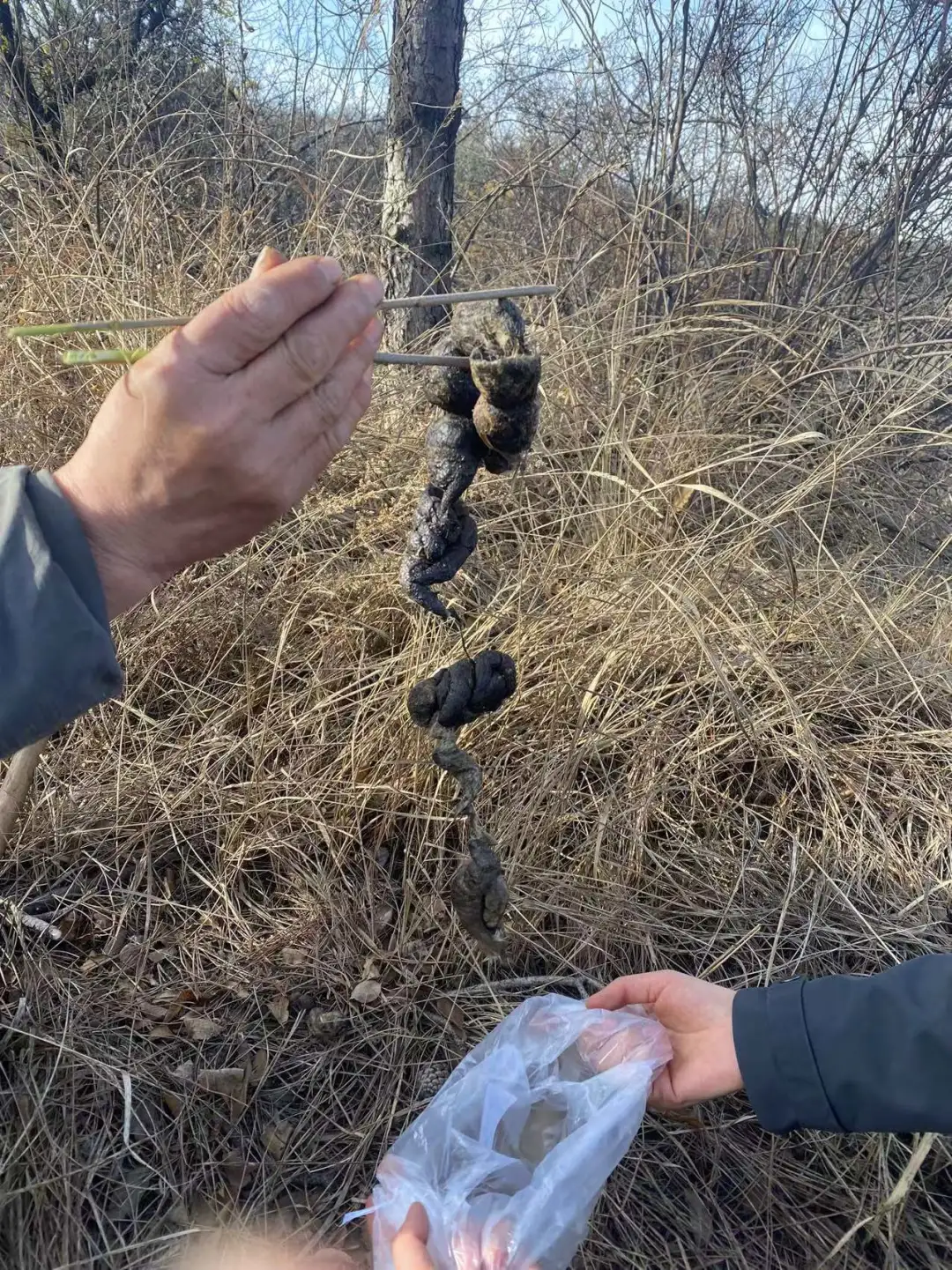 從顏色來看,這是一坨非常新鮮的豹糞,二寶推測時間差不多有一週。我們興奮地拍了照,記錄好座標,我從揹包裏翻出一個乾淨的塑料袋,二寶已經用樹枝自制好一雙筷子等着了。
