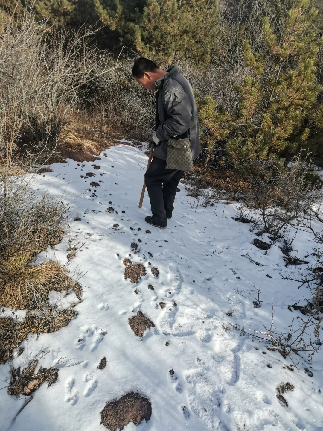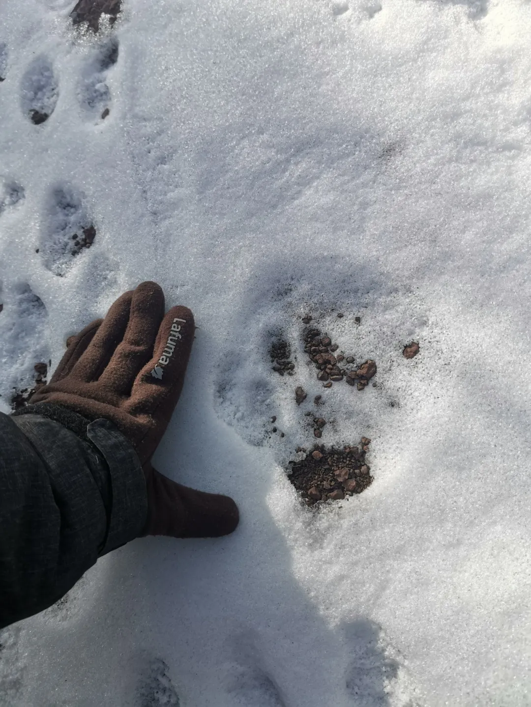 雪地上融化出幾個巴掌大小的圓圈,二寶用斧頭柄指給我看:“豹腳印。”我不明所以,這咋看出來的呢?沿着這幾個圈再往前,果然看到兩隻尚未消融的完整豹爪印,和前面的窟窿連起來 呈現出一條明顯的足跡鏈。