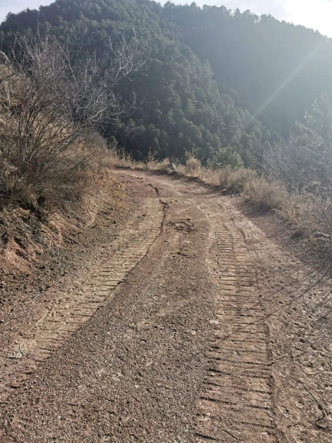 下山途中經過一個水庫,左邊一條岔道上,有兩條非常粗的車輪印子,二寶説這麼寬的印子只能是挖機的。時間尚早,我們決定進去看看。