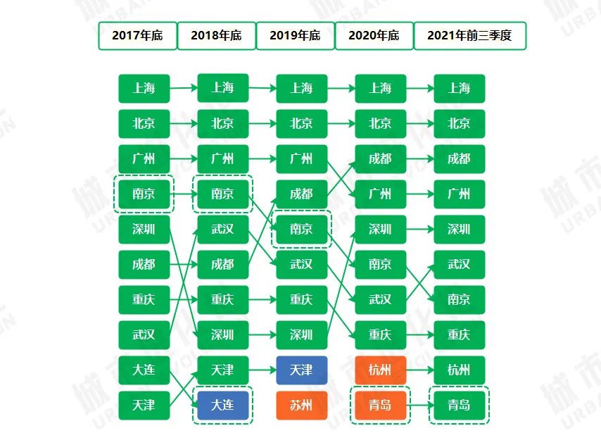 回到軌交運營里程的“十強榜單”,近幾年城市的位次變化,也印證着這一點。