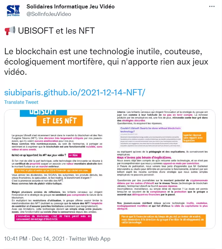 而很快,曾經直接指控並起訴育碧職場性騷擾問題的法國工會Solidaires Informatique,也因為NFT相關問題公開指責育碧。