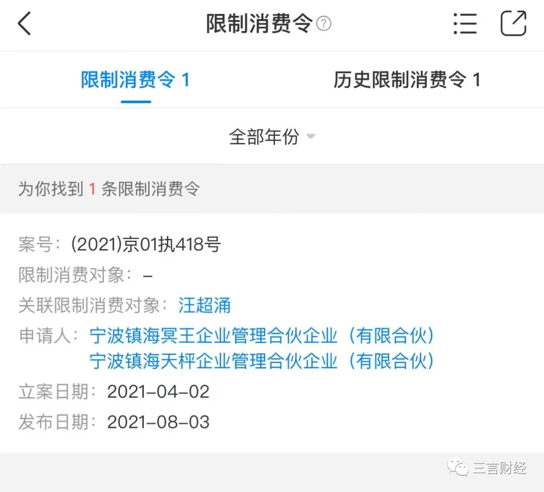 而且,汪超湧本人也有兩條限制消費令,立案日期是今年4月。