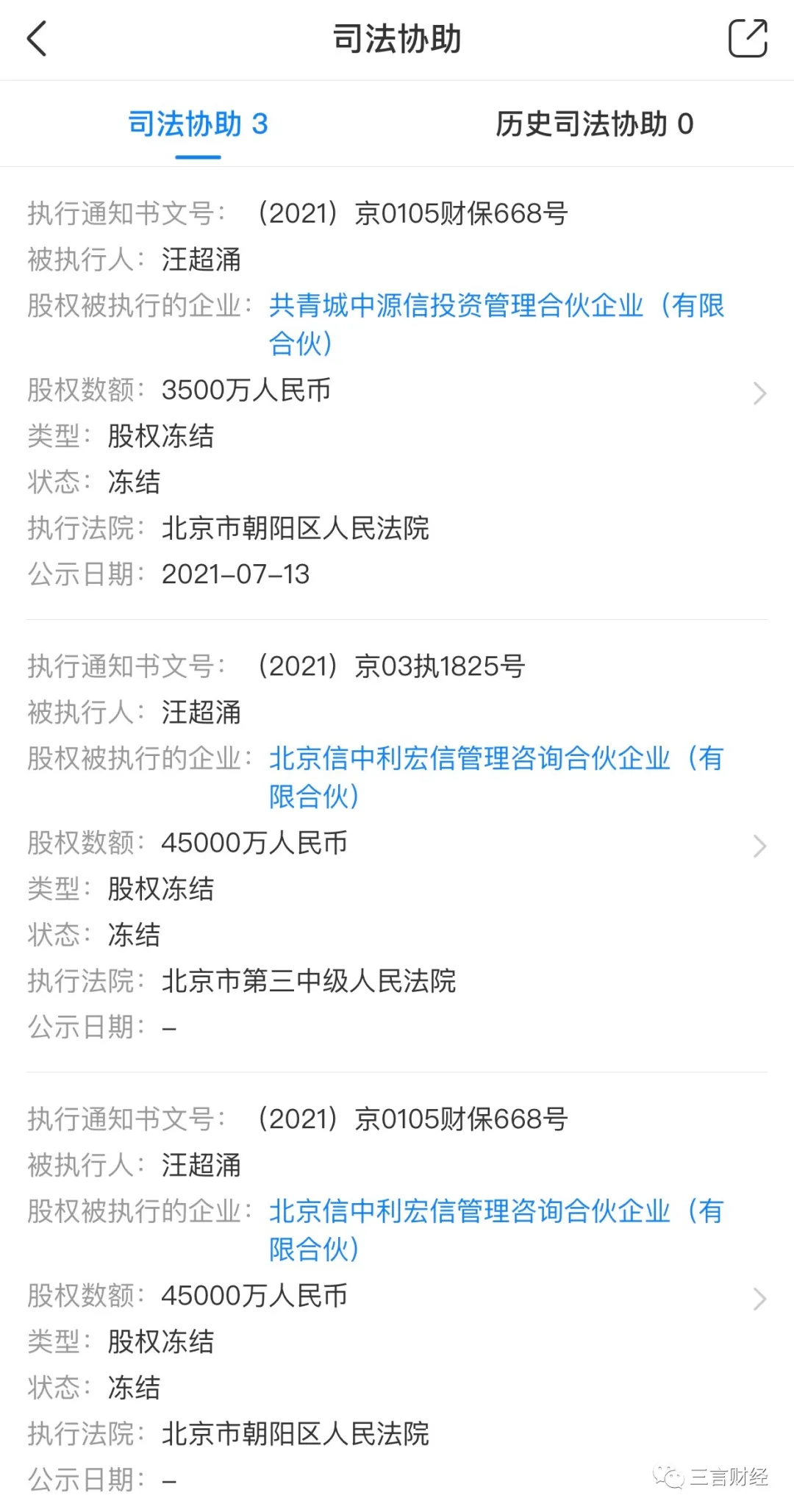據天眼查,汪超湧名下的北京信中利宏信管理諮詢合夥企業、共青城中源信投資管理合夥企業等數家公司有8項股權凍結記錄;而僅司法協助這一欄目中的三條股權凍結金額就已經高達9.4億元。