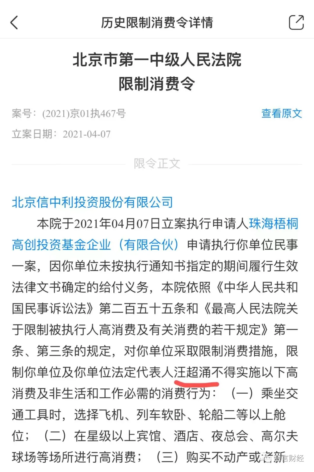 而汪超湧自己創辦的信中利也於今年4月被限制高消費;而且分別在今年4月與10月有兩條被執行信息,總執行標的為1.216億元人民幣。