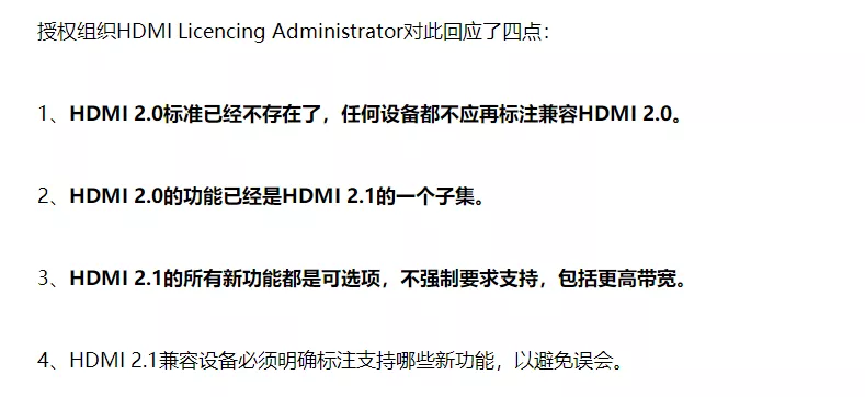 但是該機構仍質疑這種寫法是否合適,所以向負責 HDMI 授權許可的組織進行了確認,得到的反饋是HDMI 2.0 標準現在已經不存在了,叫 2.1 沒毛病: