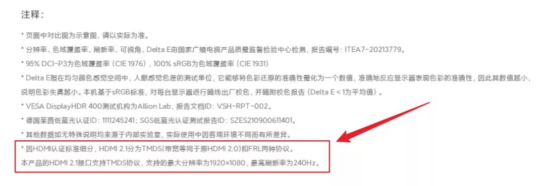 儘管廠商在宣傳頁右上角標了個 * 號註釋説明它的這兩個 2.1 接口其實等同於原來的 HDMI 2.0: