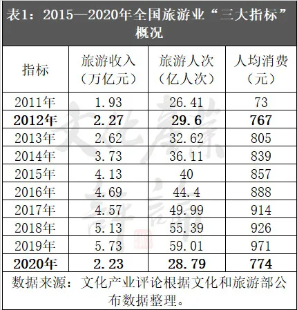 從全國範圍看,受新冠肺炎疫情影響,2020年度國內旅遊人數28.79億人次,比上年同期減少30.22億人次,下降52.1%;國內旅遊收入2.23萬億元,比上年同期減少3.50萬億元,下降61.1%。人均每次出遊花費774.14元,比上年同期下降18.8%。2020年旅遊業“三大指標”僅恢復到疫前2011年至2012年的區間水平(詳見表1)。