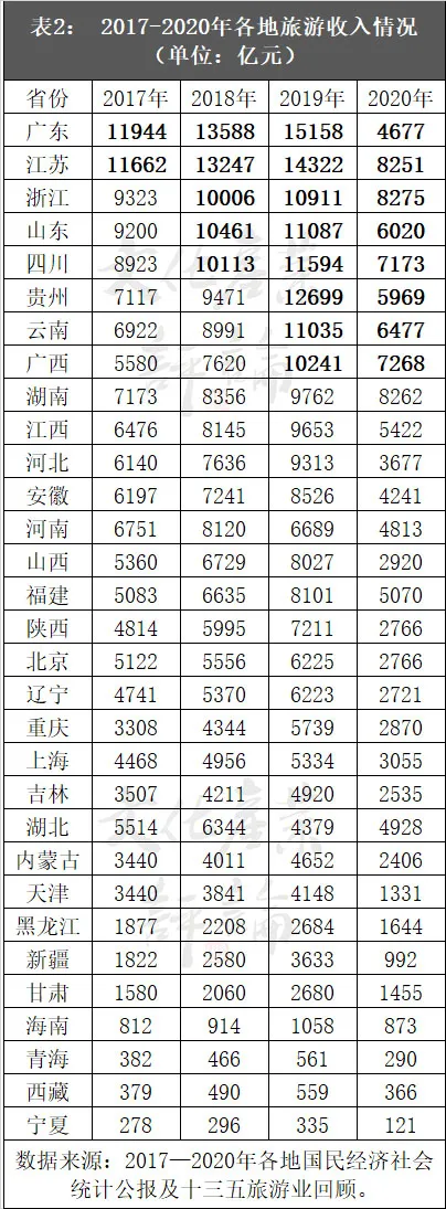 從31個省(區、市)具體情況看,疫情前,年度旅遊收入排名前十位的省份,分別是廣東、江蘇、浙江、山東、四川、貴州、雲南、廣西、湖南、江西等。其中,2017年廣東、江蘇2省旅遊收入超過萬億;到2019年廣東、江蘇、浙江、山東、四川、貴州、雲南、廣西8省邁入“萬億俱樂部”。2020年受新冠肺炎疫情影響,旅遊業業陷入前所未有之困,各省旅遊收入重回千億時代,多地旅遊收入腰斬(詳見表2)。