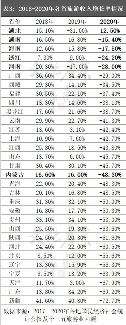 從疫後旅遊收入增速上看,2020年增速前五位的省份分別是湖北(12.5%)、湖南(-15.4%)、海南(-17.5%)、浙江(-24.2%)和河南(-28%)。其中,2019年河南、湖北兩省旅遊收增速為負增長,消弭了疫情因素的影響程度。此外,2020年全國旅遊收入增速為-47%,內蒙古、青海、吉林等15個省份均低於全國平均值(詳見表3)。