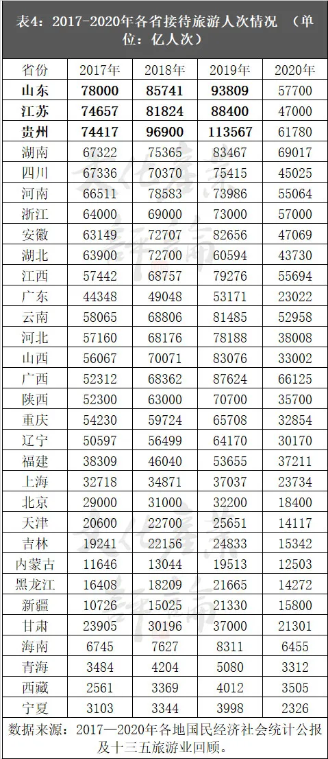 從31個省(區、市)旅遊人次看,2020年疫情前,接待遊客總人次排在前三的省份分別為山東、江蘇和貴州,三省2018年旅遊人數均超過8億人次;2019年湖南、安徽、雲南、山西、廣西等五省旅遊人次也進入8億方陣。而疫情後,所有省份旅遊接待人次均低於7億人次,且多地出現嚴重下滑態勢(詳見表4)。
