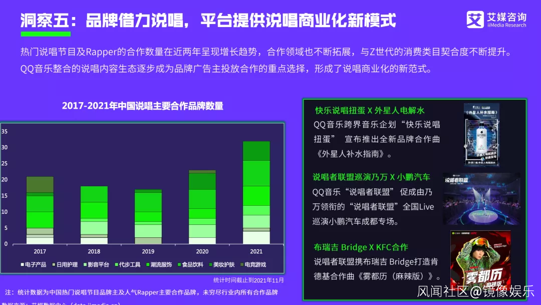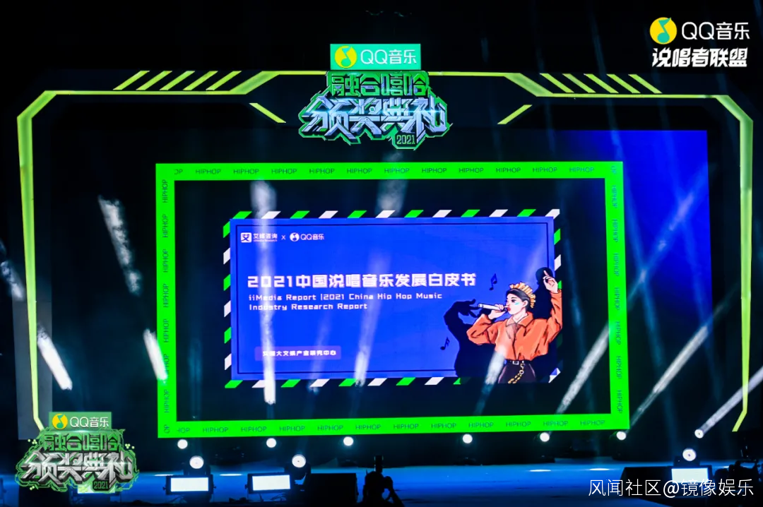 當晚,QQ音樂聯合艾媒諮詢發佈的《2021中國説唱音樂發展白皮書》(下稱“白皮書”),正是對2021年中文説唱做出的全方位分析,進一步從發展特點、行業價值、消費羣體、未來趨勢等多個維度,更細化地剖解和記錄中國説唱的成長,展現在過去一年中,在以QQ音樂為首的數字平台助推之下,中文説唱如何正向發展。