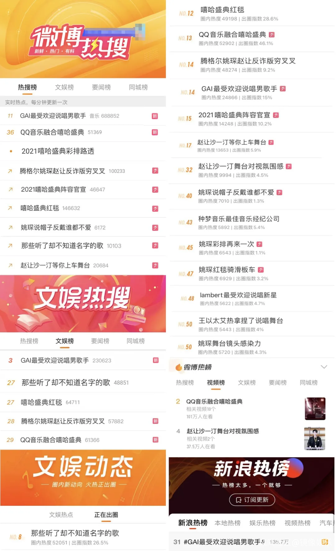 紅毯、演出、頒獎…典禮全程效果拉滿,既有沙一汀、趙讓令人“雙廚狂喜”的合作舞台,也有騰格爾親自下場快嘴Diss二手煙的“跨界説唱”,今年表現亮眼的説唱新人Wiz_H張子豪、Lambert也攜手登台,奉上了自己的熱歌《young boss2.0+Restart重啓》…#QQ音樂融合嘻哈盛典#、#嘻哈盛典紅毯#等多個典禮相關話題也衝上熱搜,足見“年會”的影響力。