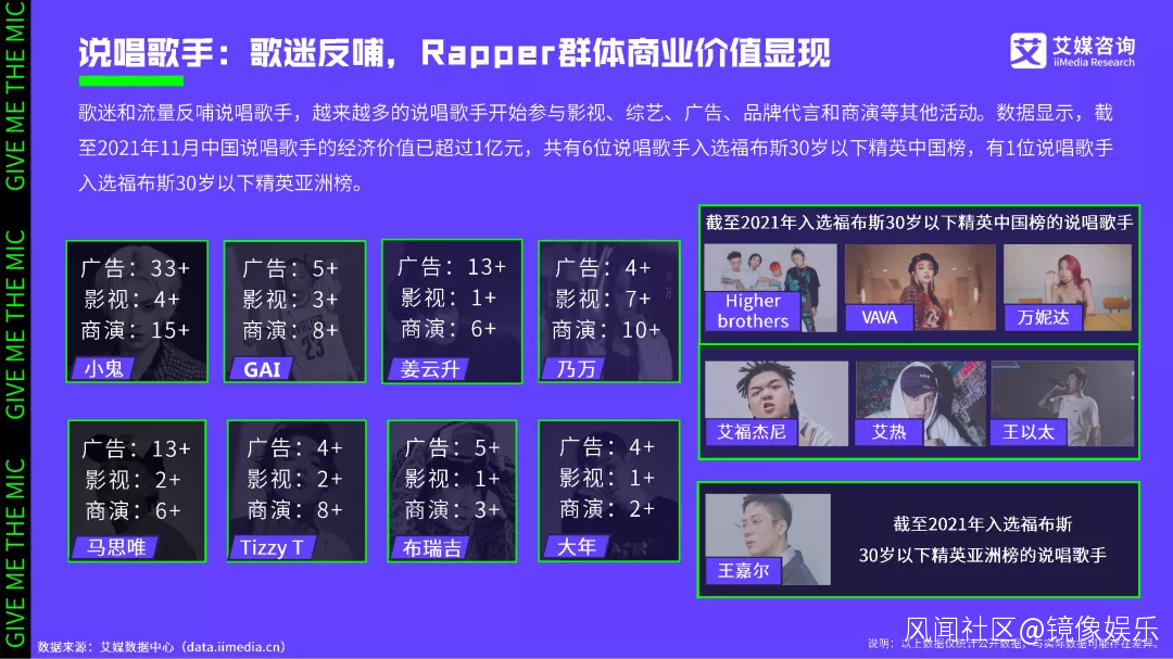影響力提高最終表現為商業價值的躍升。相關數據顯示,截至2021年11月,中國説唱歌手的經濟價值已超過1億元。在這之中,Higher brothers、VaVa毛衍七、萬妮達等6位説唱歌手入選福布斯30歲以下精英中國榜,王嘉爾則入選福布斯30歲以下精英亞洲榜。