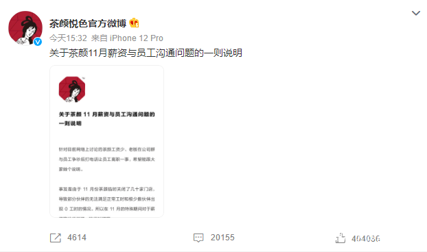 呂良則在道歉信中稱,茶顏悦色十一月的薪資調整,是基於公司業績不佳、長沙區域部分門店臨時閉店等運營動作所做的臨時性調整。