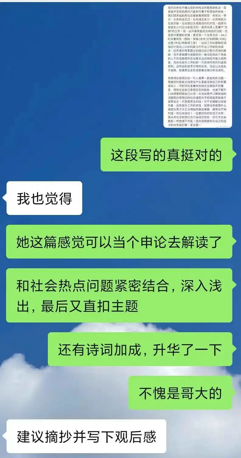 説真的這篇都可以當申論來解讀了,這是網友看過的小作文裏最有水平的,格局也挺大的:除了錘渣男還有自己的思考在裏面,她自己家家境也不錯吧,後面撫養費她也不要,憑自己也可以把孩子養大成人……