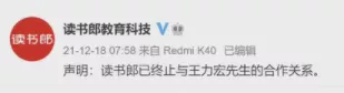 12月18日7點58分,讀書郎教育科技發佈聲明:已終止與王力宏的合作關係。