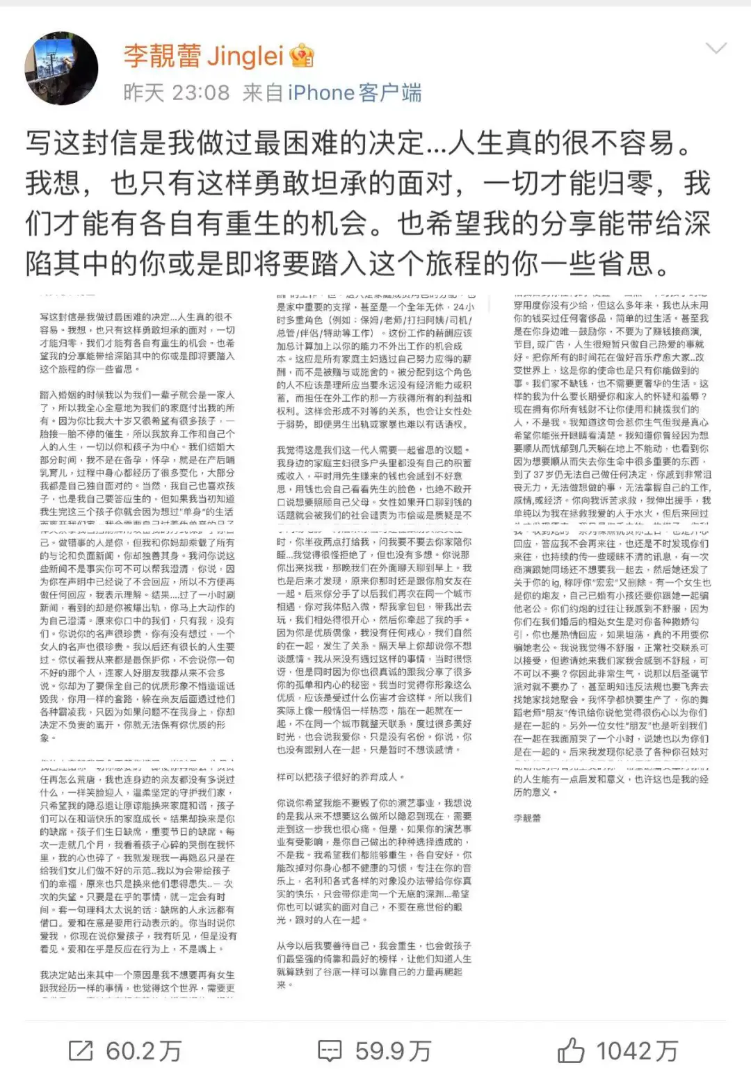 12月17日晚23點08分,王力宏的前妻李靚蕾髮長文回應離婚。