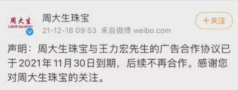 12月18日9點53分,周大生珠寶發佈聲明:與王力宏廣告合作協議已於2021年11月30日到期,後續不再合作。