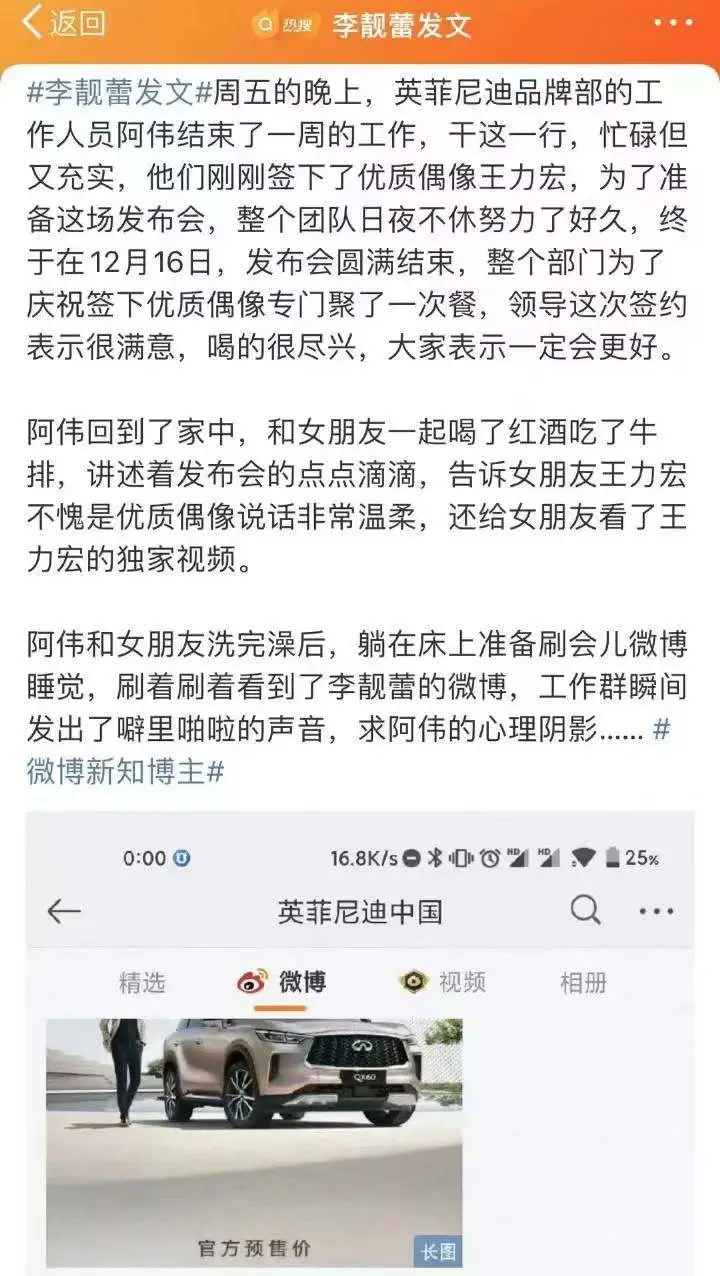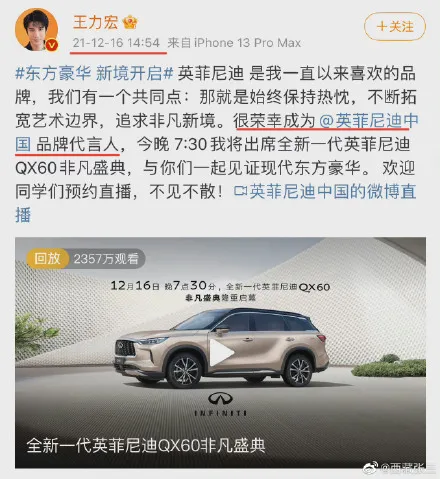 而12月16日14時,英菲尼迪才官宣王力宏成為品牌代言人,從官宣到解除合作相隔35小時。