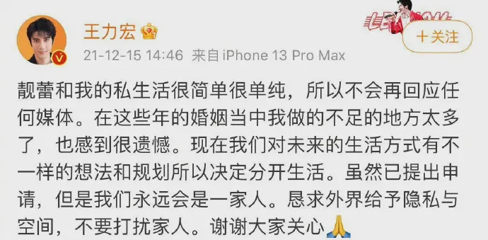這一刻再對比12月15日王力宏的回應離婚的聲明,説自己和靚蕾的私生活很簡單很單純,真的很諷刺了。