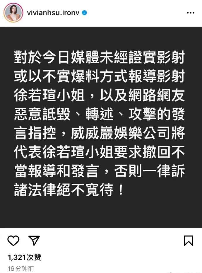 深夜徐若瑄發ins回應她和王力宏的傳聞,表示:對於媒體的影射和網友的詆譭,請立刻撤回報道和發言,否則一切交給法律,決不寬待!