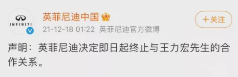 12月18日凌晨1點22分,英菲尼迪刪除了與王力宏相關的動態和點贊,宣佈:即日起終止與王力宏的合作關係。