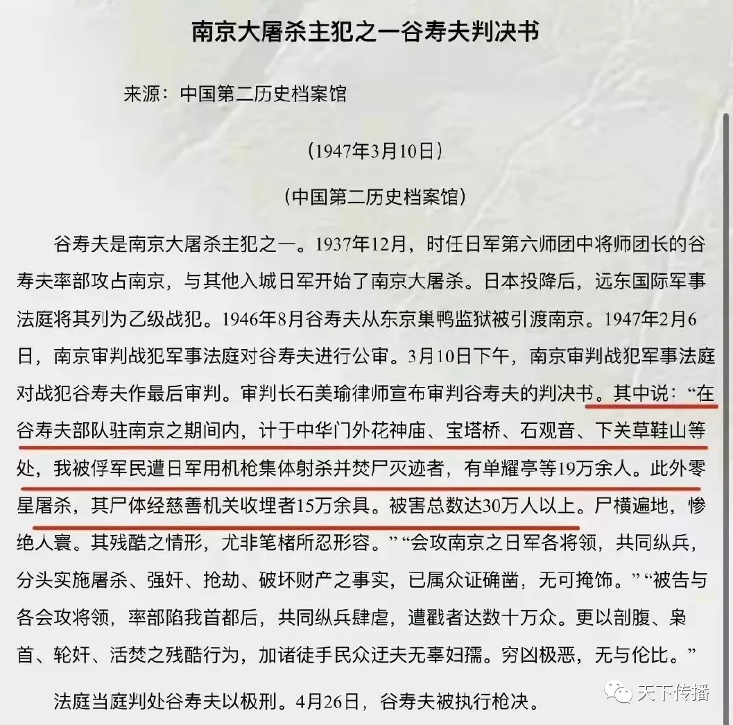 第一,1946年1月19日設立的遠東國際軍事法庭認定:在日軍佔領南京後的最初六個星期內,南京及附近被屠殺的平民和俘虜,總數達20萬以上。