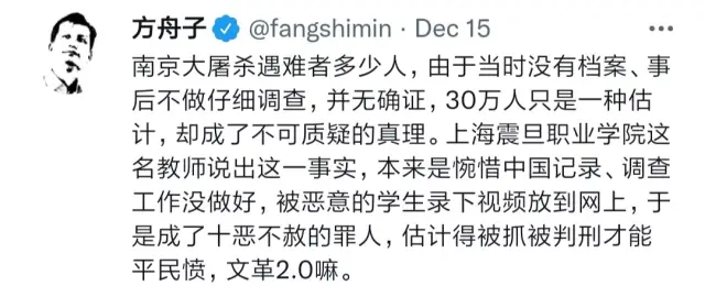 上海有個震旦職業學院,一位女老師,上課時討論南京大屠殺的數字,被學生偷拍上網。輿論譁然,學校將其開除。