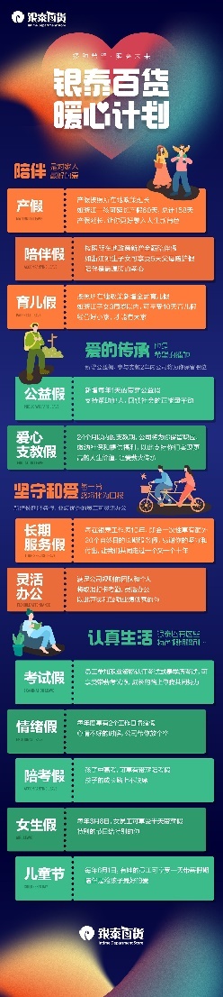 繼阿里巴巴集團、螞蟻相繼宣佈升級多項員工福利政策後,12月16日,有媒體報道,銀泰百貨也宣佈多項員工福利升級:除響應國家號召,延長產假、新增育兒假等一系列假期福利外,還針對性推出了老員工的長期服務假,以及頗具特色的情緒假、陪考假、公益假、愛心支教假等。