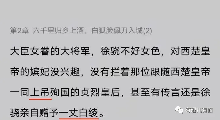 而且在《雪中悍刀行》這部原作中,對西楚皇室自殺是這樣描寫的:“徐驍······沒有攔着那位跟隨西楚皇帝一同上吊殉國的貞烈皇后,甚至有傳言還是徐驍親自贈予一丈白綾。”顯然,劇版處理成切腹自盡完全是劇組在夾帶私貨。