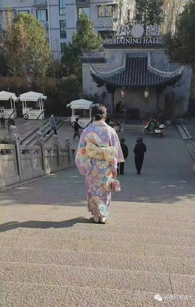 12月13日當天,浙江嘉興一女子身穿和服在海寧南關廂歷史文化街區逛街被網友抓拍。