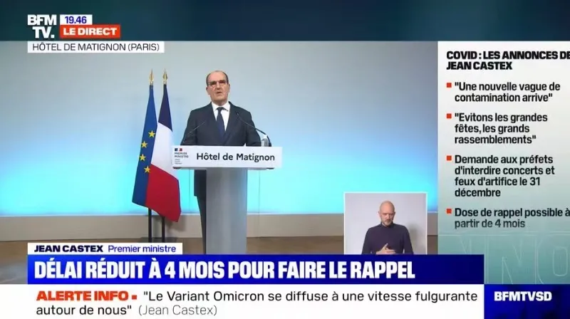 總理宣佈,將於1月初向議會提交一項法案,將健康證(pass sanitaire)轉變為疫苗接種通行證(pass vaccinal),只有接種疫苗才有效。同時,他希望加強對假健康證的控制和處罰。
