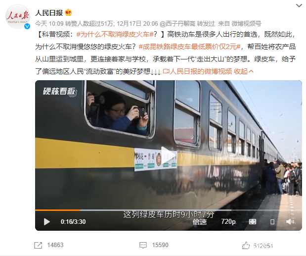 看到人日的微博今天分享的這個視頻,還有挺有感觸的。沒錯,如果説高鐵體現的是中國速度,那麼綠皮車體現的就是中國温度。