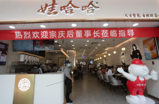 去年,娃哈哈也嘗試跨界奶茶店,在廣州開出首個直營茶飲店,主打“AD鈣奶+水果”的組合,定價為人均15元左右,並打出要開1萬家店的目標。
