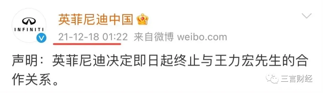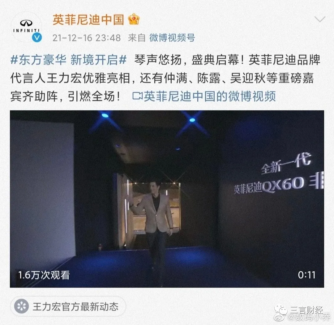 其次,王力宏創造了史上最短代言,僅1天,英菲尼迪凌晨宣佈終止合作。