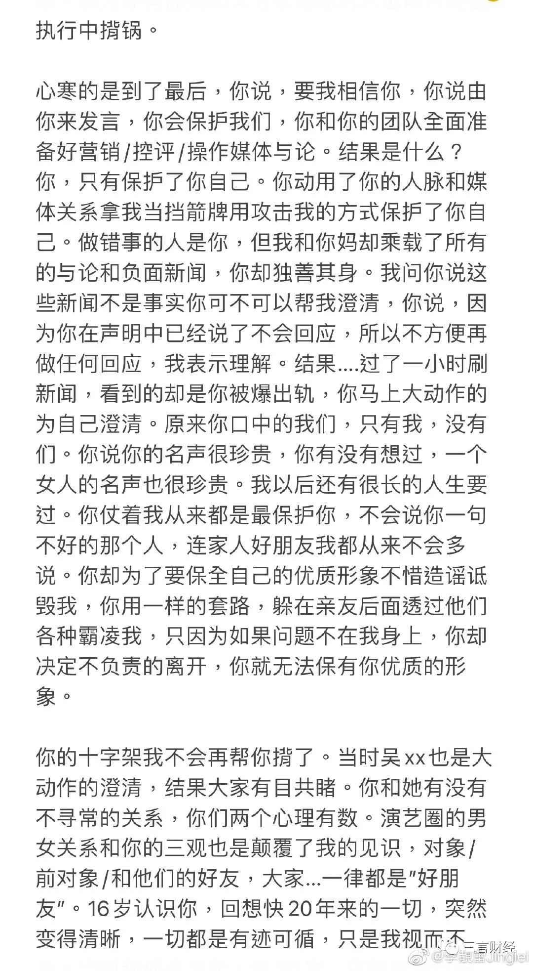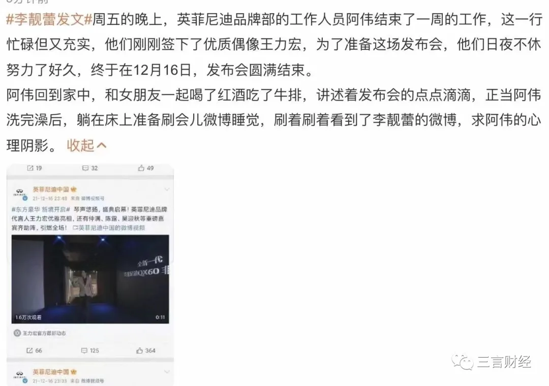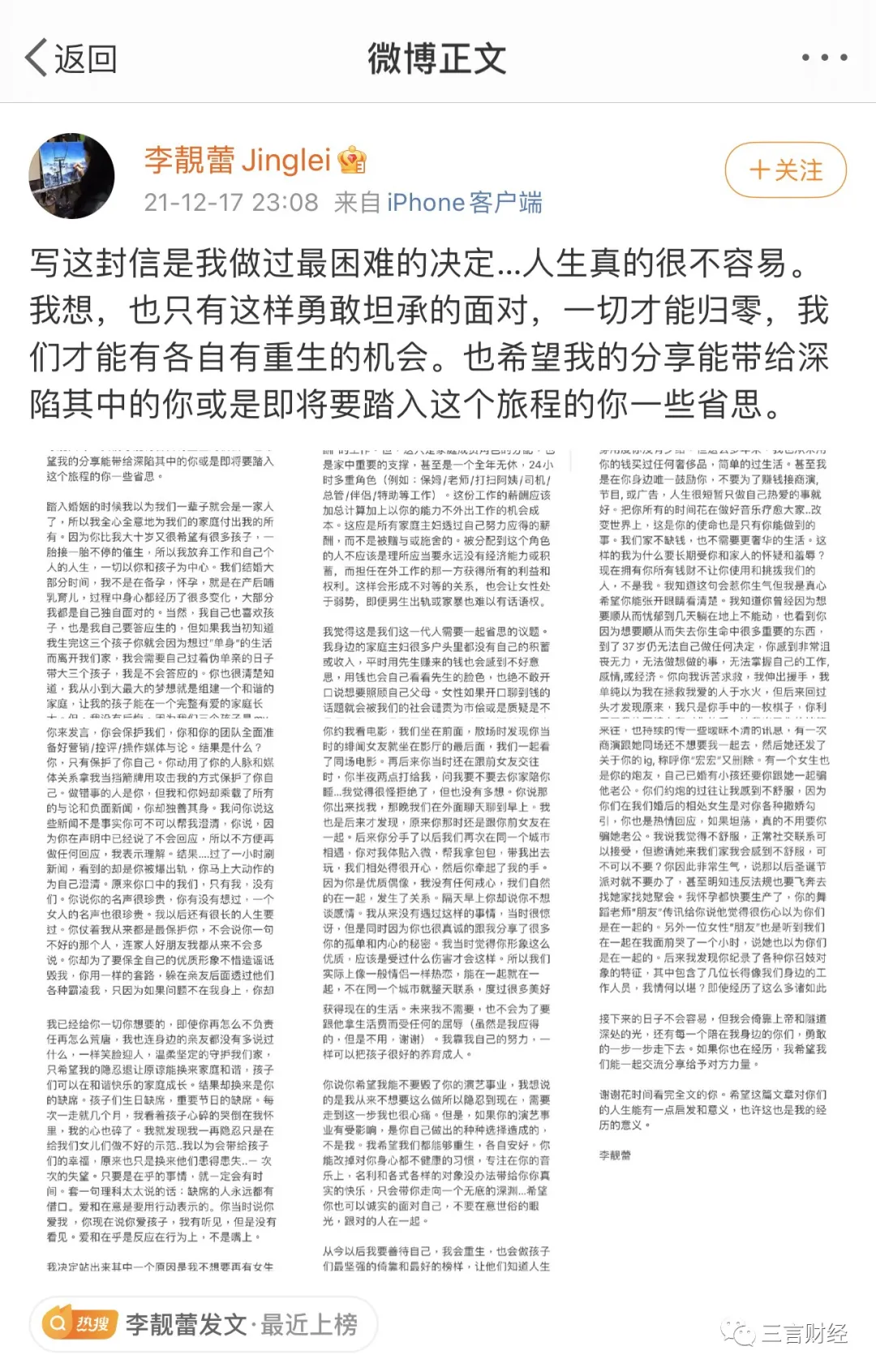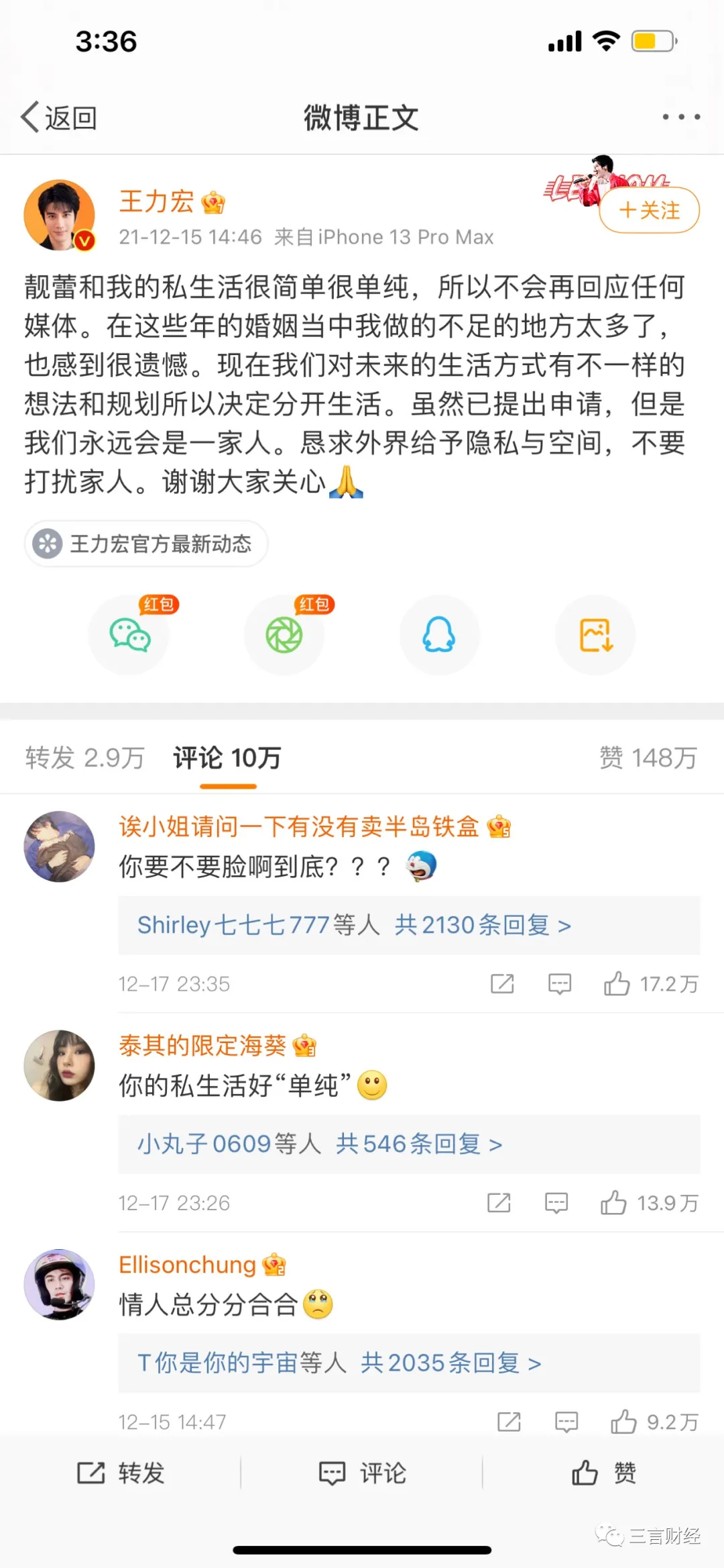 三言財經凌晨消息(文/迪麗冷巴) 小編起夜發現手機被各種push彈窗,《王力宏被前妻李靚蕾長文控訴出軌》,羣裏各種討論“他她、娃哈哈、xrx”等等。