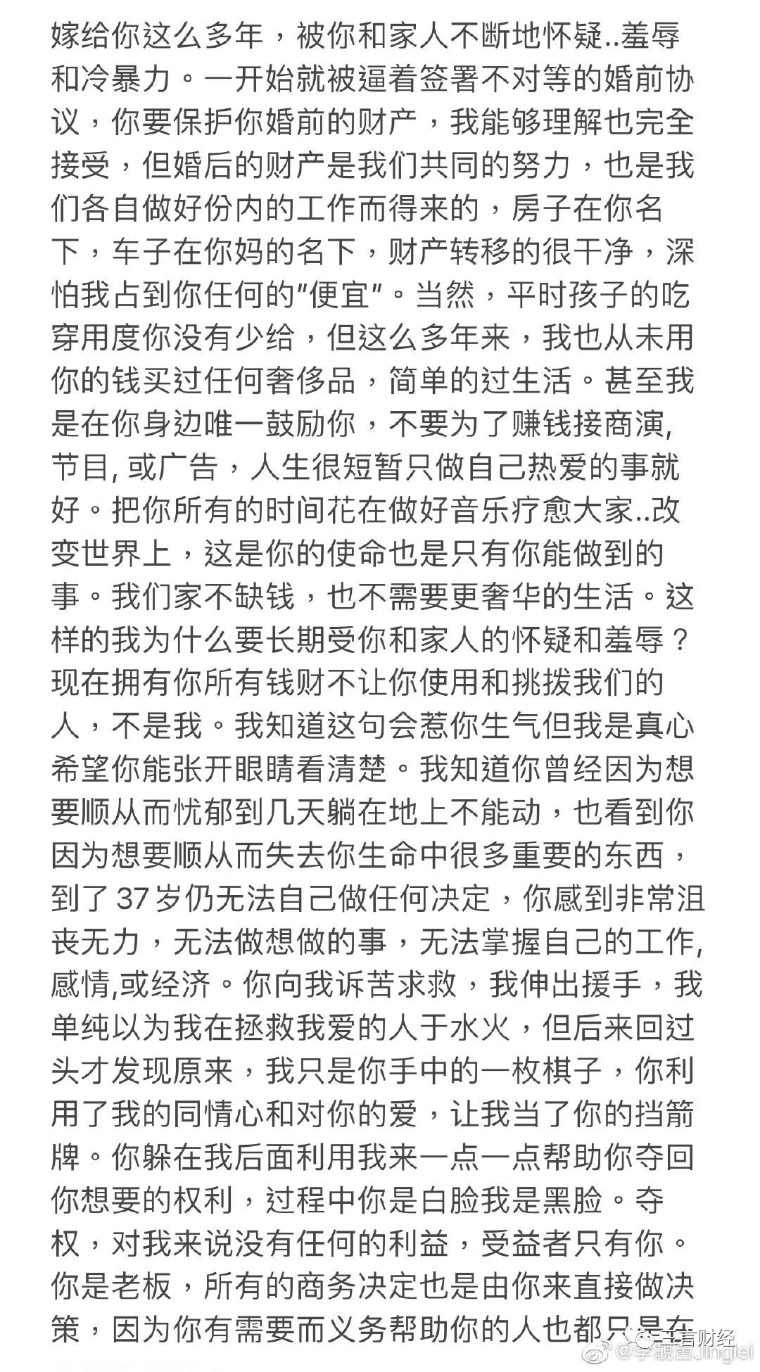 首先,李靚蕾深夜控訴王力宏長文劃重點(全文在結尾):1、王力宏希望有很多孩子,李靚蕾放棄工作生育3個孩子,王力宏卻在她生完3個孩子後拋棄她;2、在婚姻中,李靚蕾全年無休、24小時飾演保姆、老師、打掃阿姨、司機、伴侶等各種角色,提到用錢就會遭受丈夫的臉色;3、婚姻期間,李靚蕾遭到王力宏及其家人不斷地羞辱、冷暴力。婚前二人簽署了婚前協議,王力宏保護自己的財產,婚後的財產也都在王力宏或者王媽媽的名下;4、李靚蕾鼓勵王力宏追求夢想,但王力宏卻把李靚蕾當做棋子和對抗家人的擋箭牌;5、李靚蕾16歲就認識王力宏,王力宏主動跟她曖昧,並且帶她去看電影,結果王力宏當時的緋聞女友也坐在同個電影院的最後一排。後來王力宏與前女友分手後,主動約李靚蕾併發生了關係,時候卻表示不想談感情;6、李靚蕾指王力宏婚前曾多次帶女生回家,也曾向她承認召x之事;7、王力宏婚前就和py糾纏不清,還拍大尺度照片,婚後,也和py繼續來往,疑似該py為女歌手;另一名女py則是已婚有小孩,王力宏還邀約她到家中聚會;還有一位py也曾找李靚蕾哭訴;8、王力宏表示,如果遇見喜歡的女生,不想對方被人説是小三,所以堅決要離婚;9、王力宏的家庭生活裏,長期缺席孩子們的成長,李靚蕾的隱忍只換來了他越發過分的行為;10、李靚蕾對於發佈長文後,對王力宏的事業影響有所準備,但表示希望世人不要再被王力宏欺騙,她自己也會靠自己去做孩子們的榜樣。