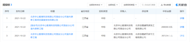 雷達財經通過天眼查查詢發現,創晟建築中標了北京中公教育科技有限公司淮安分公司室內裝修項目,合同價約28.80萬元,承接工期為60天,裝修面積約1027平方米,發佈日期為2021年10月。