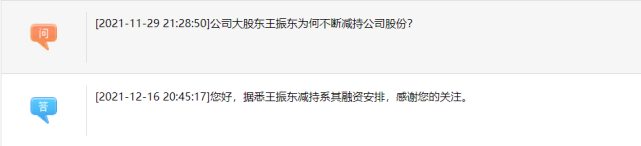 在互動問答中,曾有投資者詢問“公司大股東王振東為何不斷減持公司股份”。對此公司回覆稱,系融資安排。