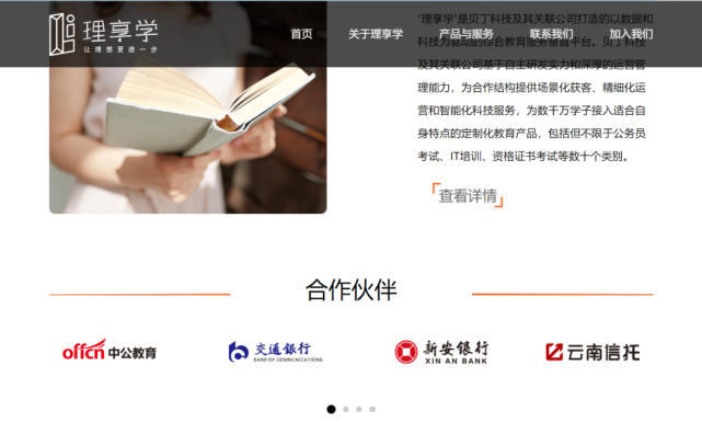 官網稱,“理享學”是貝丁科技及其關聯公司打造的以數據和科技為驅動的綜合教育服務垂直平台。貝丁科技及其關聯公司基於自主研發實力和深厚的運營管理能力,為合作結構提供場景化獲客、精細化運營和智能化科技服務,為數千萬學子接入適合自身特點的定製化教育產品,包括但不限於公務員考試、IT培訓、資格證書考試等數十個類別。